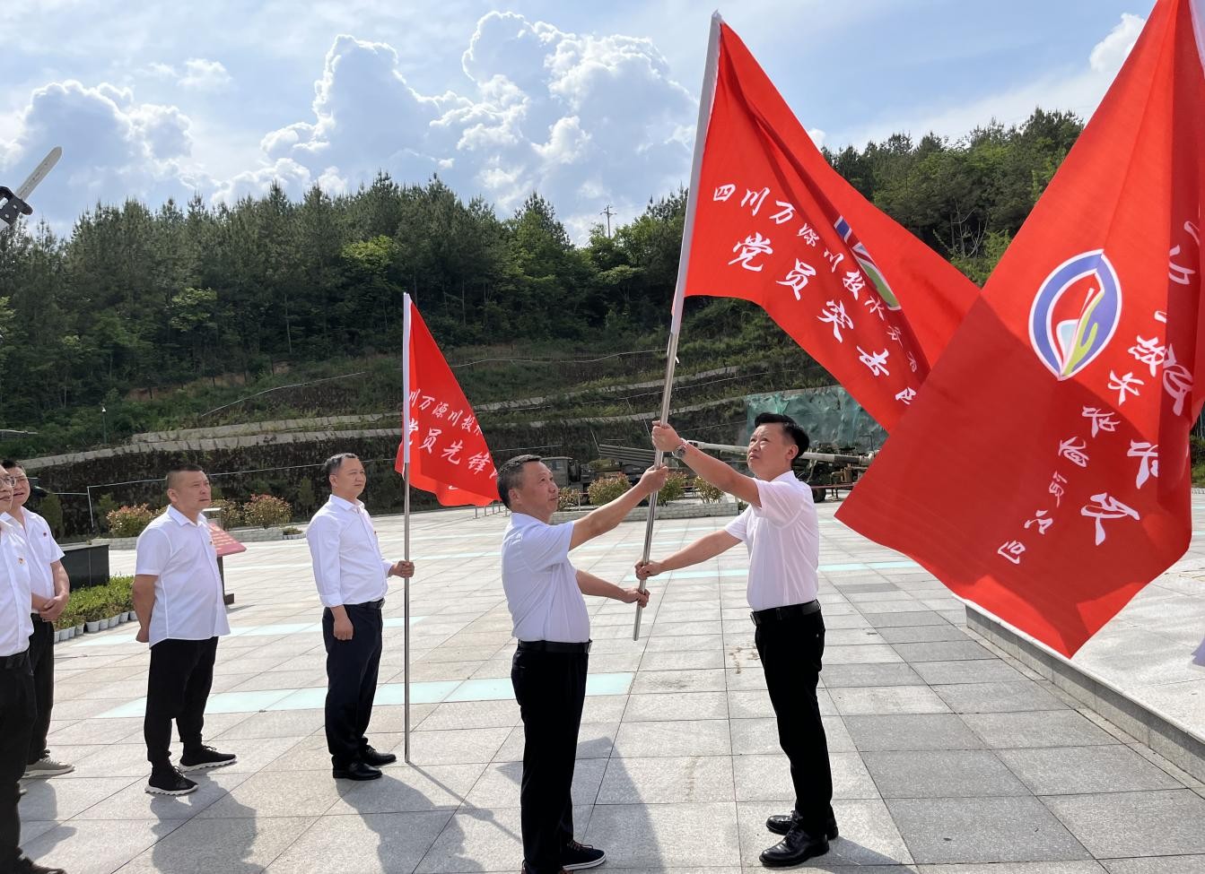 儀式中,李至彬宣讀了《中共四川萬源川投水務(wù)有限公司支部委員會(huì)關(guān)于成立“黨員先鋒隊(duì)、黨員服務(wù)隊(duì)、黨員突擊隊(duì)”的通知》文件以及三支隊(duì)伍成員名單,并向三支隊(duì)伍現(xiàn)場(chǎng)授旗。接過旗幟,就是接過重托與使命,接過旗幟,就代表責(zé)任與擔(dān)當(dāng)。