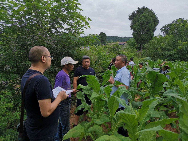 在田間地頭,杜總查看煙葉的長勢,詢問農(nóng)戶水果的收成,農(nóng)戶庭院經(jīng)濟的規(guī)劃和發(fā)展。在青山村種煙大戶李孝林的煙地里,杜總與李孝林進行深入的交流,并對其聘請貧困戶幫忙干農(nóng)活掙工錢的做法十分認可。