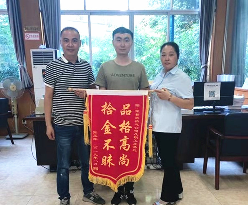 9月10日上午上班伊始,榮縣天然氣公司就收到張女士送來(lái)的一面錦旗,她對(duì)拾金不昧的營(yíng)銷部員工王浩屹表示感謝和贊揚(yáng)。