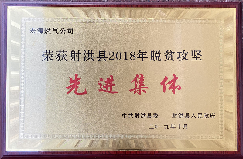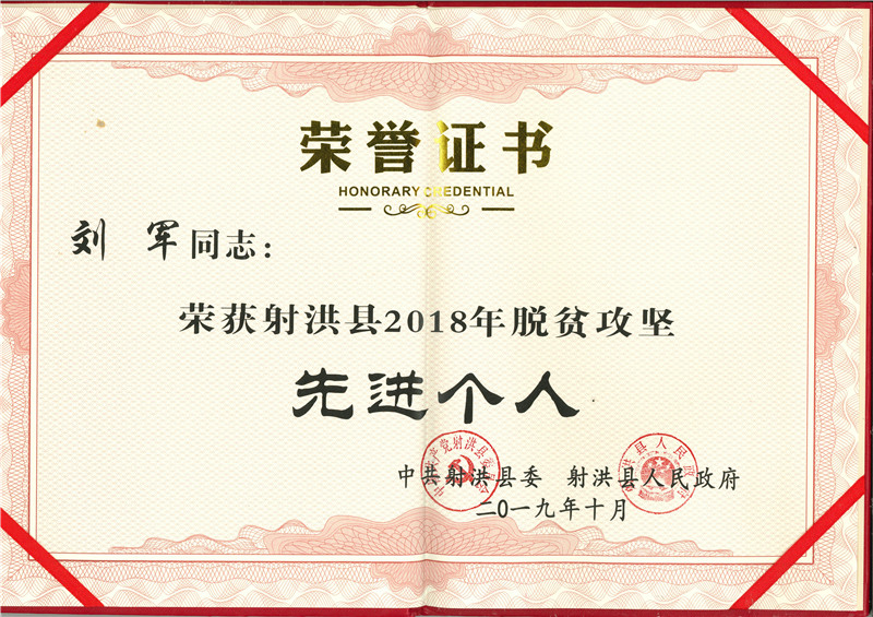 2019年10月15日,在射洪縣文化藝術(shù)中心召開的“大愛扶貧 濟善射洪—2019年射洪縣脫貧攻堅暨社會扶貧工作推進會”上,宏源公司被中共射洪縣委、射洪縣人民政府表彰為“射洪縣2018年度脫貧攻堅先進集體”,公司團委書記、大榆鎮(zhèn)飛石溝村駐村工作隊隊員劉軍被表彰為“射洪縣2018年度脫貧攻堅先進個人”。
